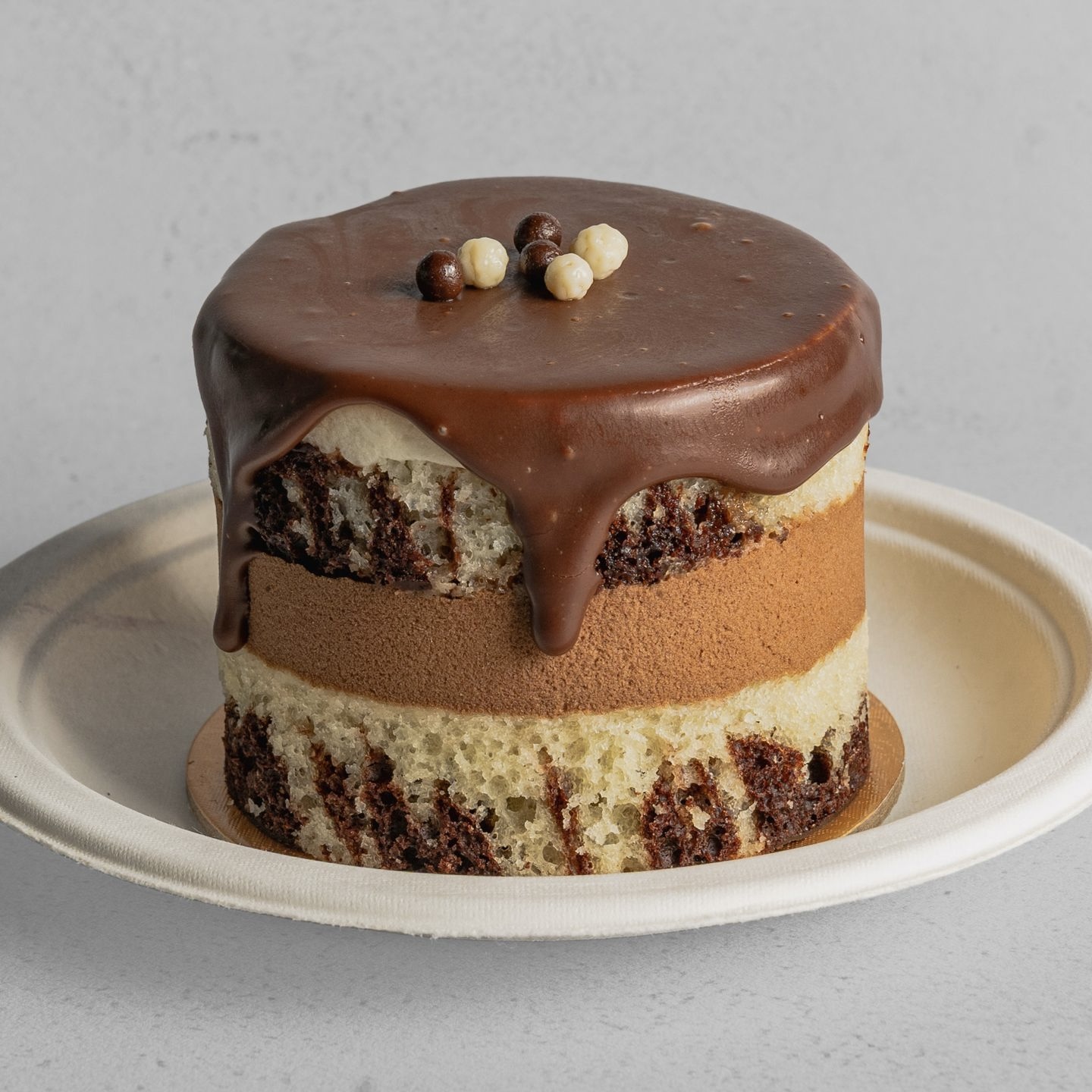 Layers of dark chocolate mousse, cream cheese mousse and marbled cake